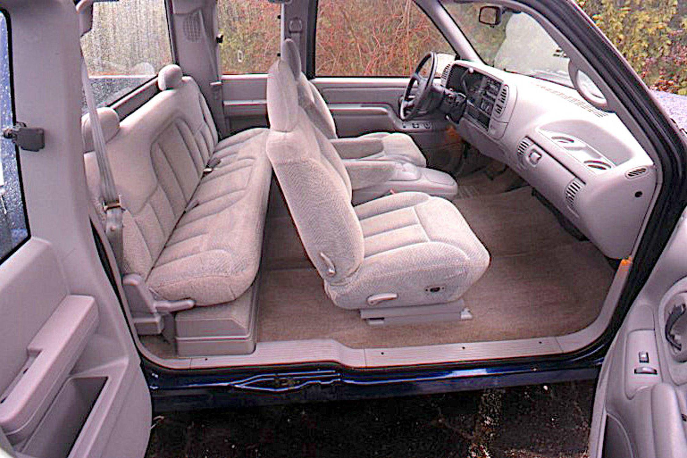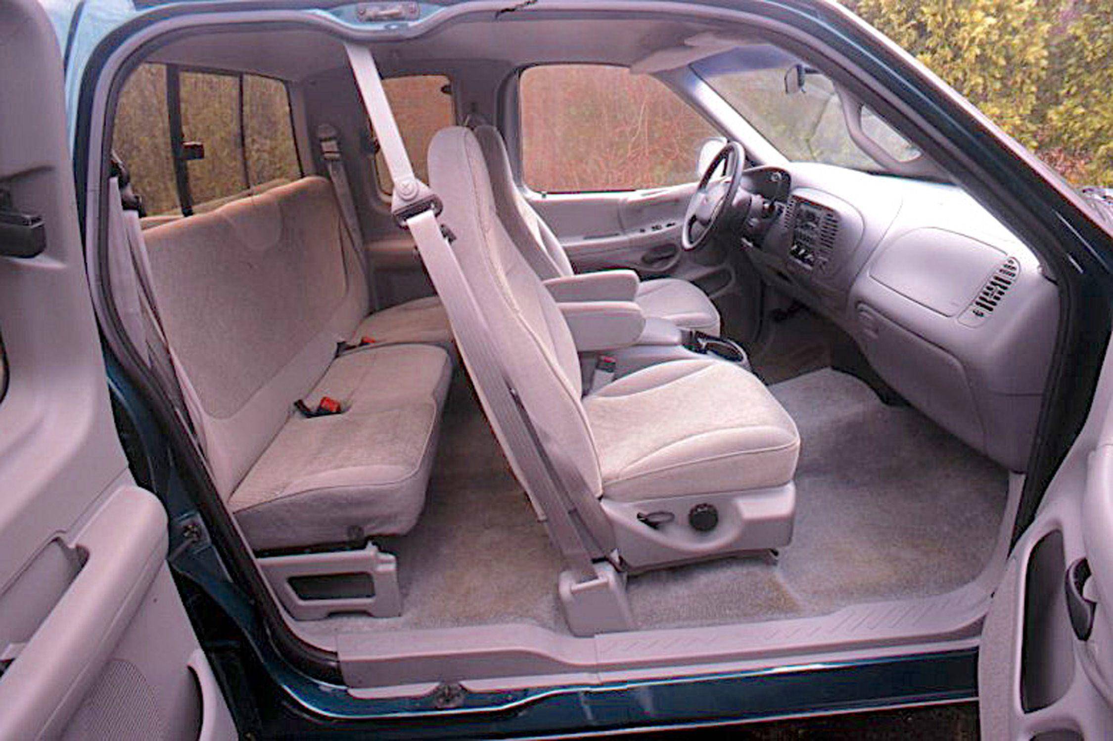 车内,福特显然比道奇或雪佛兰显得更有现代感。前面座椅支撑性强,后面座椅则雕刻出完美空间,三种卡车中空间最大。实际上,尽管在纸面上,它的空间比雪佛兰少,但福特的后座是我们可以在这里坐上几个小时而不会发牢骚的地方。第三扇门内部有锁,所以后座乘客在有人打开主乘客门之前可以先自行下车。福特还配备了乘客侧气囊,并在仪表台上有一个键可以关闭,如果你在这个空间里安装了背向式婴儿座椅。后排的 bench 座椅是分开的,这样你可以携带各种人员及物品。