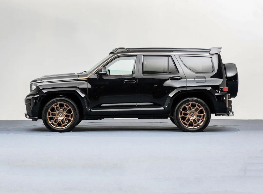 采用黑色与金色的搭配色,中网、前包围、前发动机盖、车顶、轮圈、后包围、后扰流板都用到的很夸张的套件,所以尺寸大了一截。