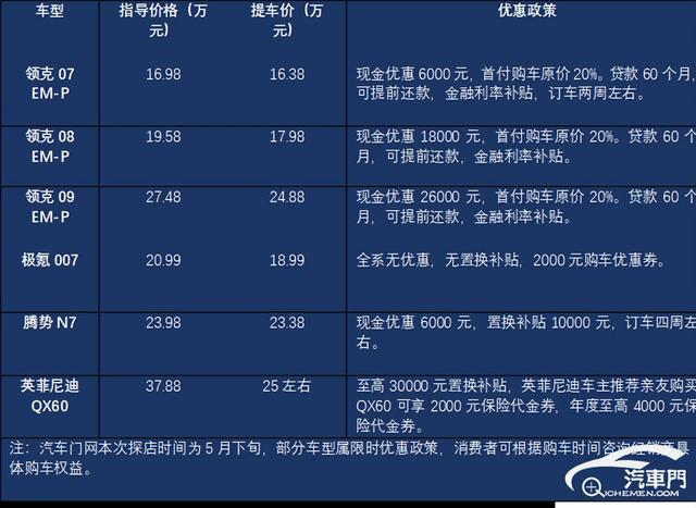 不难看出,领克旗下的领克09 EM-P的优惠幅度最大,高达26000元;腾势汽车其次,优惠幅度6000元;极氪汽车价格坚挺,全系无优惠,只有2000元购车券。另外,合资燃油车英菲尼迪优惠价格也高达120000元。