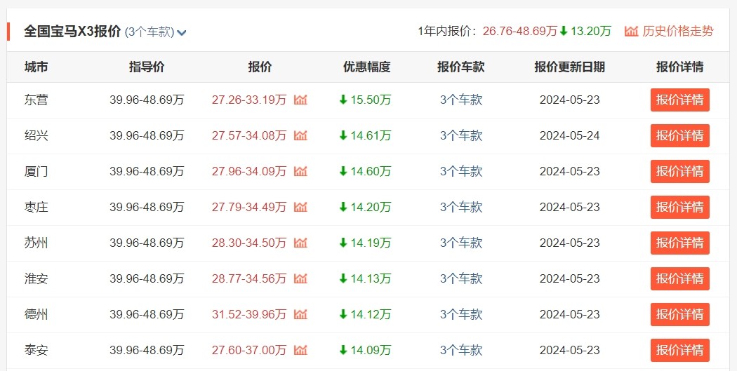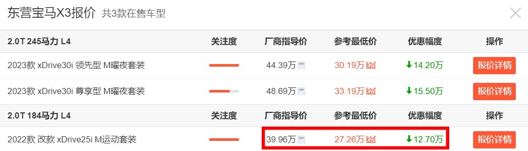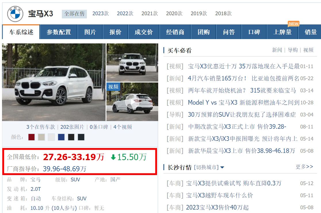 不过,在今天这个国产新能源车崛起的时代背景下,很多朋友可能要打破原先对于宝马X3的一些认知了,为啥这么说呢?因为从我们近期在4S店所了解到的情况以及结合网上面给出的报价来看,原价近40万起步的宝马X3,其实眼下在终端的最低价格已经来到了27万多。而且这个价格在全国很多地区都有,这也就证明:宝马X3终端优惠大、价格跳水已经是基本的事实。
