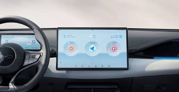 内饰部分,新车延续了比亚迪家族化设计,搭载了全液晶仪表盘+大尺寸中控屏幕,并在门板和座椅表面采用了大量曲线设计,辅以少量蓝色点缀,使得整车氛围优雅且时尚。而且挡把设计得比较小巧,各种功能按键环绕在挡把周围,看起来比较精致。