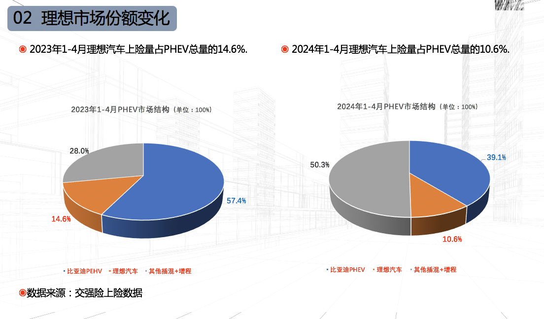 交强险上险数据显示,2024年1~4月插混+增程汽车上险量101.33万辆,同比增长83.8%。其中,理想汽车上险量10.77万辆,同比增长34.02%。在插混+增程领域,前四个月理想汽车市场份额为10.6%,与上年同期相比下降了4个百分点。