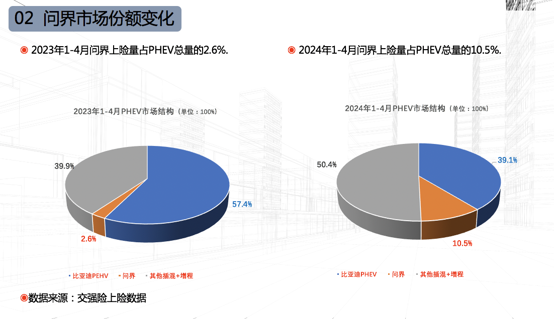 理想汽车实际销量增速下降,份额下滑的同时,问界的销量今年大幅增长。2024年1~4月问界增程式电动车上险量10.63万辆,同比增长638.3%。在插混+增程领域,前四个月问界市场份额为10.5%,与上年同期相比大涨了7.9个百分点。