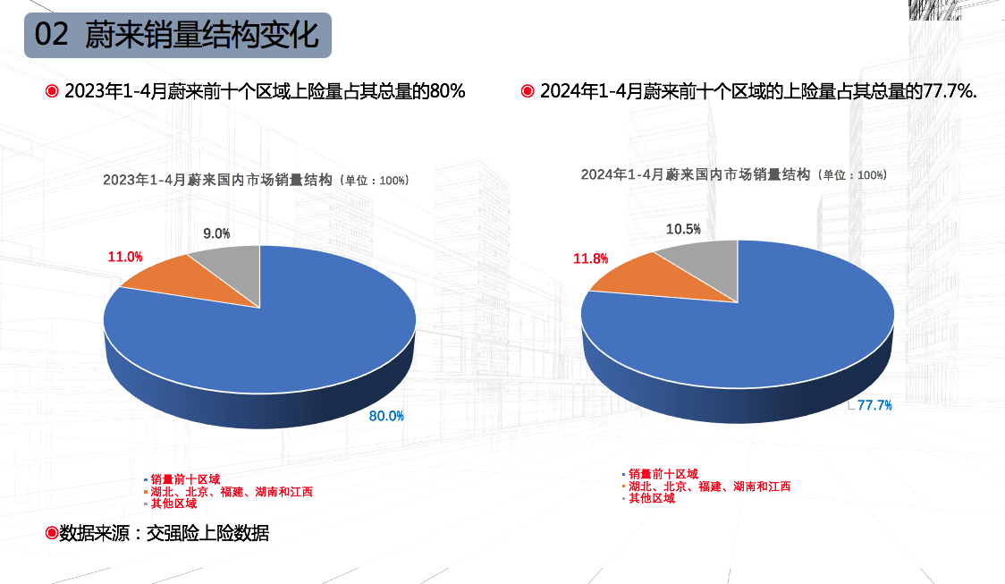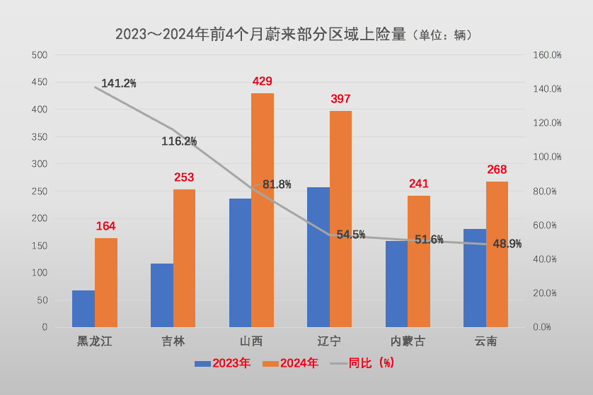 同期,蔚来似乎正有意识地降低自己的市场集中度。数据显示,前四个月蔚来在上述十个区域的上险量合计3.61万辆,同比增长14.42%。虽然十个重点区域的上险量占蔚来总量的比重高达77.71%,但与上年同期下降2.3个百分点。同时,蔚来在云南、山西、内蒙古、黑龙江、吉林和辽宁,这些区域的上险量增幅远超行业平均水平。很明显,蔚来正努力把市场从中心向周边拓展。