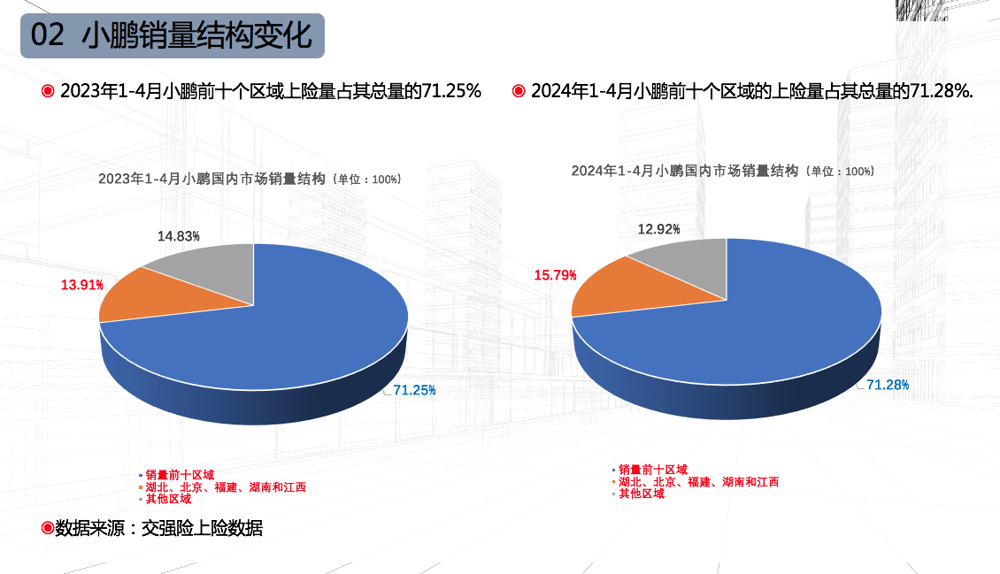与走市场分散路线的蔚来相比,今年小鹏的市场集中度好于去年。数据显示,前四个月小鹏在十个重点区域的上险量合计22.52万辆,同比增长26.96%,十个重点区域的上险量占小鹏总量的比重达到71.28%,同比微增0.03个百分点。