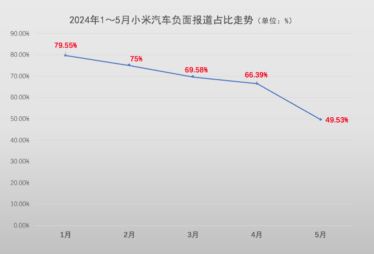 汽车企业在关注品牌传播曝光度的同时更需关注美誉度。同样以小米汽车为例,1月,自媒体对小米汽车的负面报道占比79.55%;2月,自媒体对小米汽车的负面报道占比75%;3月,自媒体对小米汽车的负面报道占比69.58%;4月,自媒体对小米汽车的负面报道占比66.39%;5月,自媒体对小米汽车的负面报道占比49.53%。