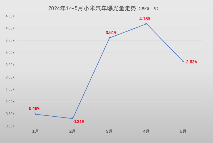 以小米汽车为例,来自选车网月度汽车品牌舆情数据显示,今年小米的曝光量正走出一波过山车行情。2024年1~5月小米汽车自媒体曝光量占当月汽车品牌曝光总量比重分别为0.48%、0.31%、3.61%、4.18%和2.63%。仅从5月数据看,小米汽车全月数据仅略高于比亚迪5月28日一场活动之后4天的数据。
