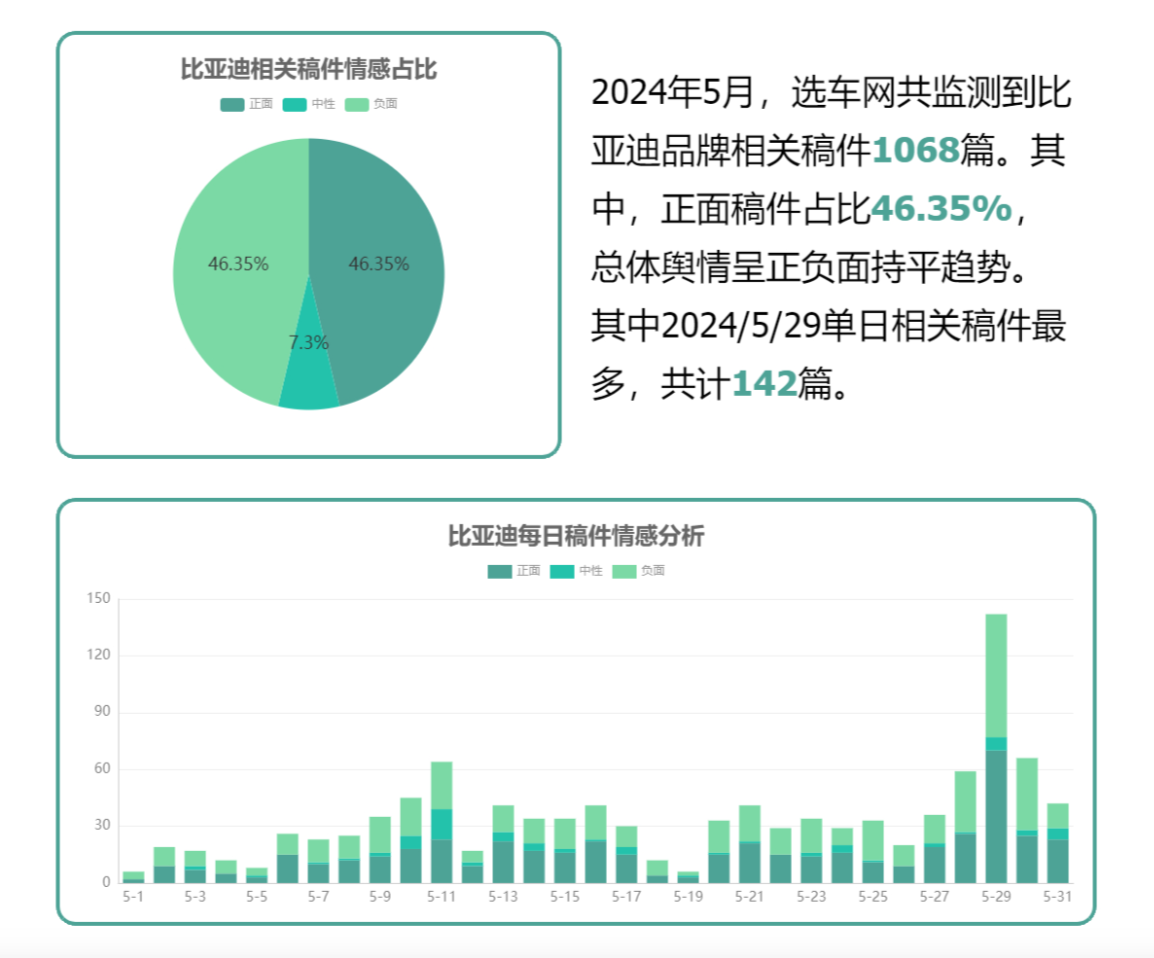 比亚迪报道量较上月大幅增加的重要原因是,5月28日西安,比亚迪举行了第五代DM技术发布暨秦L DM-i、海豹06 DM-i发布会。会上,“第五代DM技术实现发动机热效率46.06%”、“ 百公里亏电油耗2.9L”和“综合续航2100公里”等信息引发媒体热议……