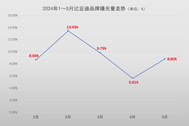 近日,选车网发布2024年5月汽车品牌舆情数据报告,比亚迪再次成为月度自媒体曝光量冠军。