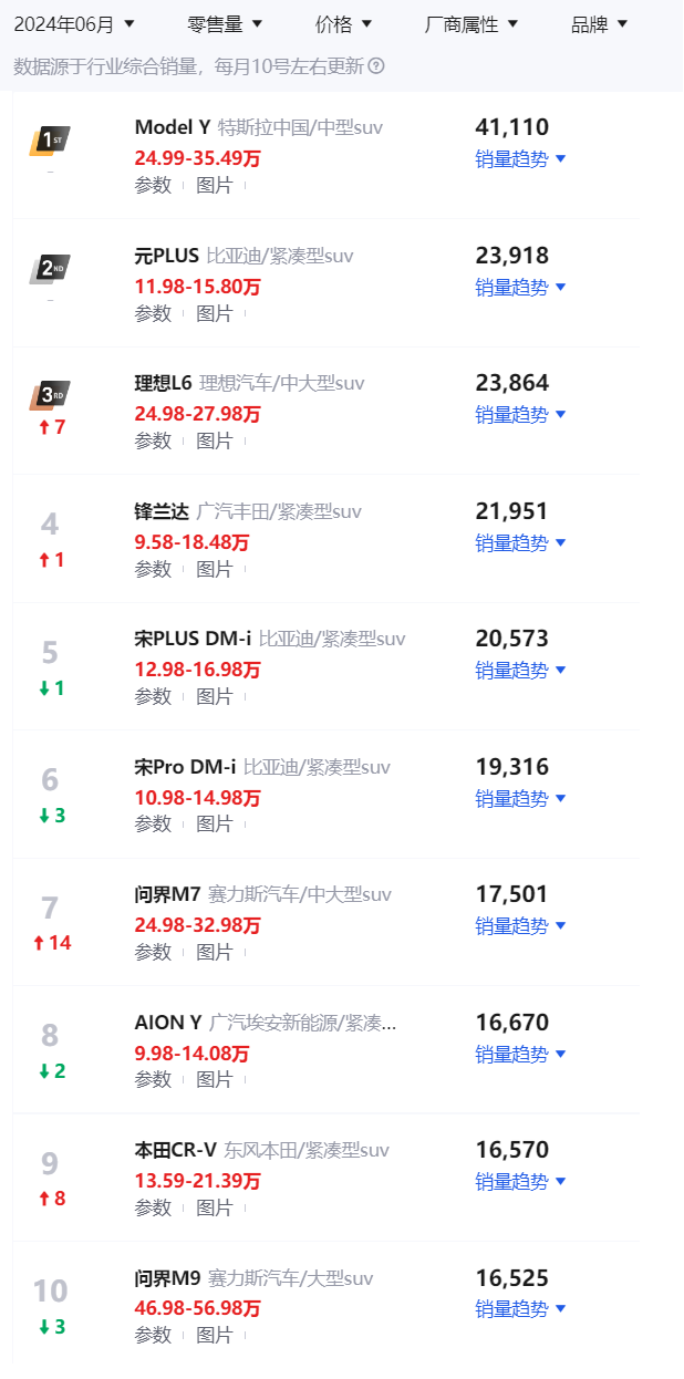 特斯拉作为第一名不再赘述,第二名是比亚迪元PLUS、销量为23918辆,第三名是理想L6、销量为23864辆。