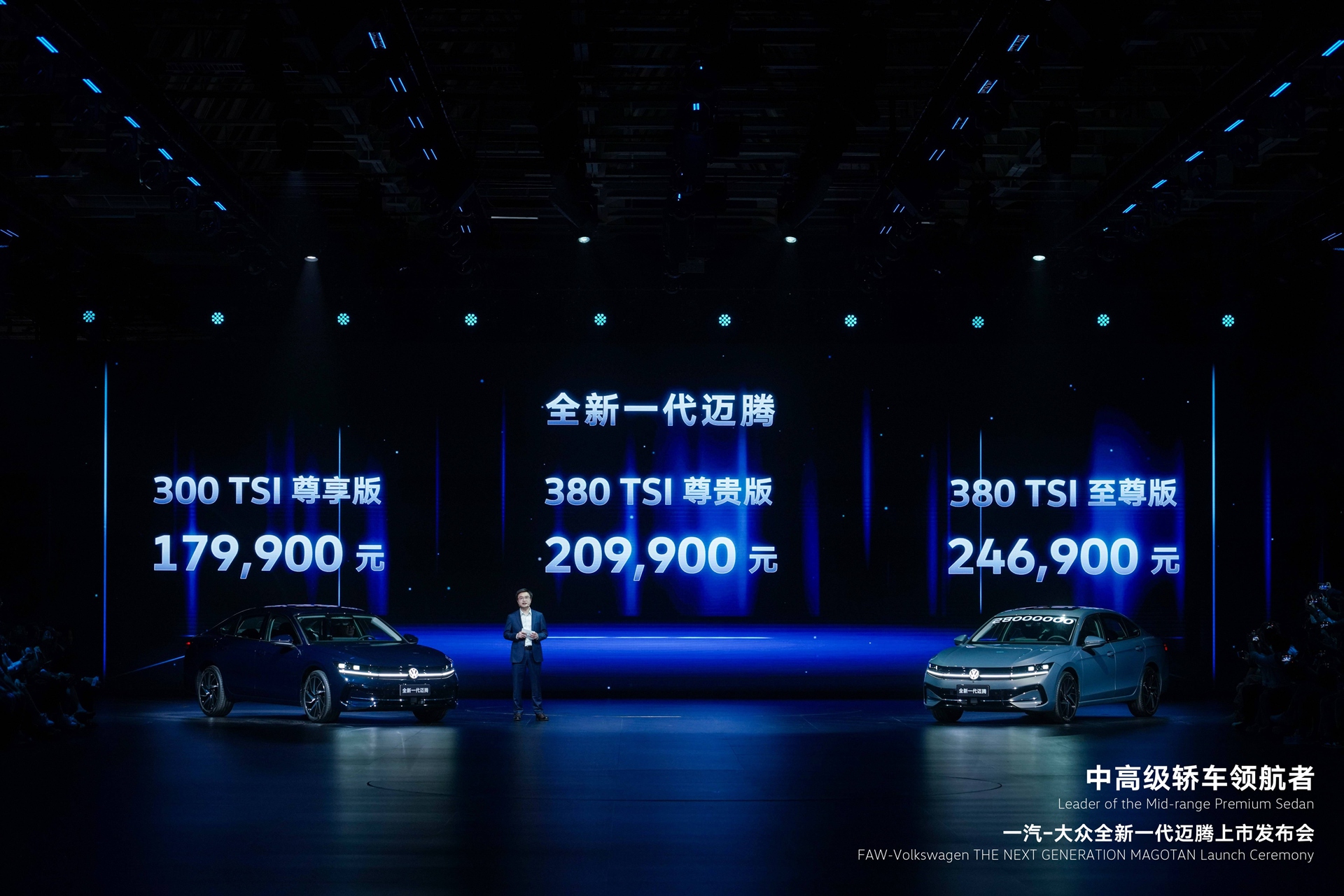 它是全新一代迈腾(参数|询价),7月9日在一汽-大众长春基地迎来正式上市,提供1.5T EVO2及2.0T高功率动力,共推出三款车型,分别为300TSI尊享版、380TSI尊贵版、380TSI至尊版,官方指导价17.99-24.69万元。
