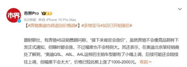 但是随着时间的推移,来到了2024年的中旬,宝马率先吹响了退出价格战的号角,随后,奔驰奥迪一一跟进,这也导致了优惠力度减小。据传言,宝马某经销商店7天调了三次价格,这也导致了部分消费者的利益受损;而奔驰奥迪同样如此,奥迪A6L 45TFSI四驱落地价约 38万元,比上个月的终端价格贵了约1万元。奔驰经销商也表示,已经收到了后期涨价的通知。