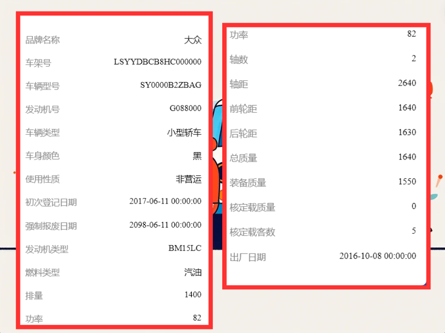 通过车牌号查询车辆信息可以知晓车辆基本信息:如车辆型号、品牌、车辆类型、车身颜色、车架号(VIN码)、发动机号、出厂日期等。车辆配置信息:部分平台或途径可能提供车辆的详细配置信息,如变速箱、驱动方式、车辆高度、尺寸类型、燃油类型、油耗、发动机最大马力、排量、排放标准等。车牌号查车辆结果样例图如下所示:
