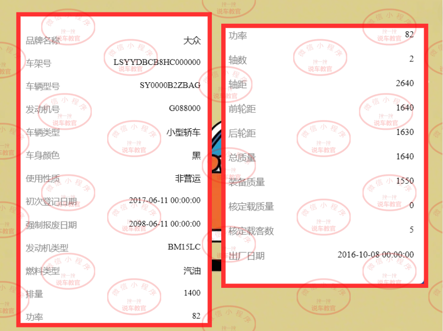 通过车牌号查询车辆信息,可以知晓汽车的品牌名称,车辆的车架号,汽车出厂日期,车子初次登记日期等等内容,下面分享一张车牌号查询车辆信息的结果样例图: