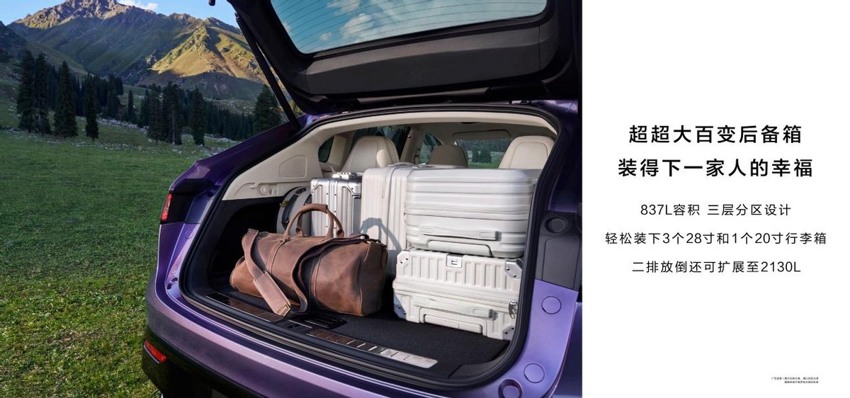 智界R7后备箱则拥有837L超大容积,独特的三层分区设计,能够轻松放下3个28寸+1个20寸行李箱。在二排座椅放倒情况下,储物空间可进一步拓展至2130L,让车辆化身超大移动储物间,装得下一家人的幸福。