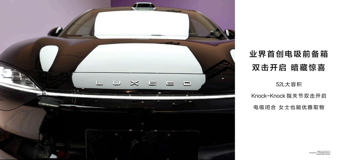 储物方面,智界R7拥有业界首创Knock-Knock电吸前备箱,52L大容积,双击即开,电吸闭合,让用户取物更轻松优雅。
