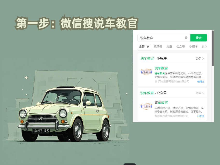- 掏出人人都有的手机,打开微信搜索【说车教官】小程序;