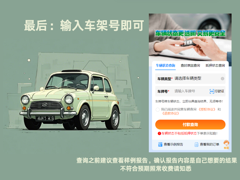 - 最后输入17位车架号或者上传行驶证,点击付款查询即可。 (查询之前建议查看样例报告,确认报告内容是自己想要的结果,不符合预期照常收费请知悉 )