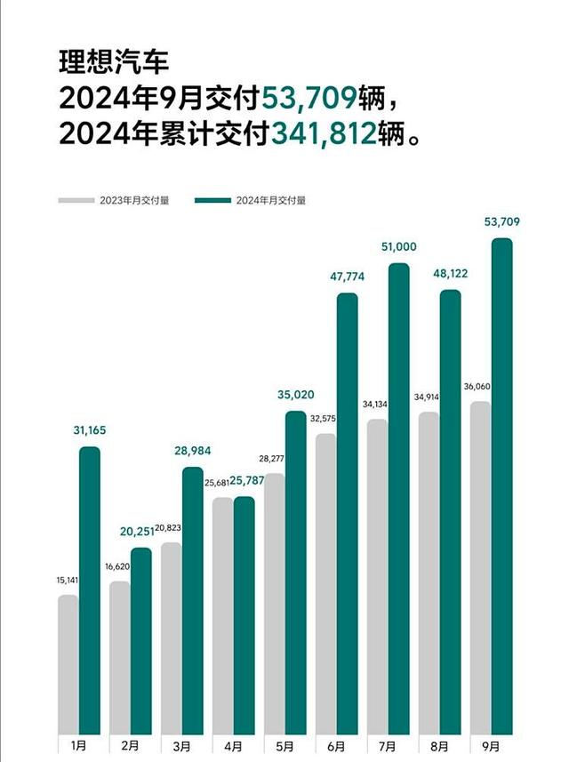 理想汽车9月交付量也很“理想”,官方数据显示,理想汽车9月交付新车53,709辆,同比增长48.9%。第三季度,理想汽车交付152,831辆,同比增长45.4%,增长的态势很猛。