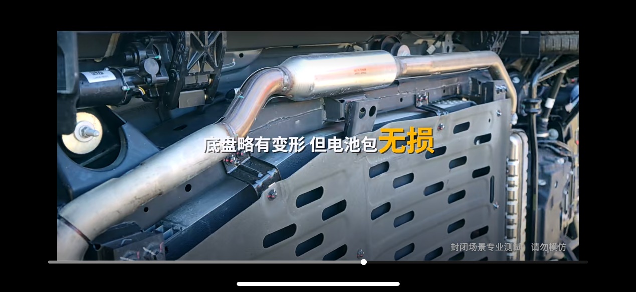 与此同时,BJ60雷霆的电池护板还经历了自重1吨的金属重物从3米高空下摆撞击向BJ60雷霆底盘,瞬间撞击力达到140000N。撞击后底盘护板甚至都没有明显变形,从我现场拍摄的照片上看,由于撞击物体接触面比较大,护板基本看不出弯曲效果。
