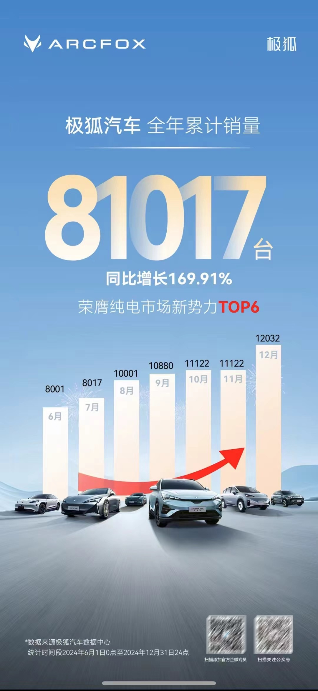 最新消息,12月,北汽新能源销量稳步攀升至16408辆;1~12月,北汽新能源总销量为113860辆,同比增长23.53%。值得一提的是,北汽极狐作为北汽新能源的明星品牌,市场表现尤为亮眼,下半年以来连续数月销量破万,在刚刚结束的12月,销量达到12032台,1~12月累计销量81017台,不仅圆满超额完成2024年度目标,更彰显了极狐在新能源汽车领域的坚实步伐与广泛认可。