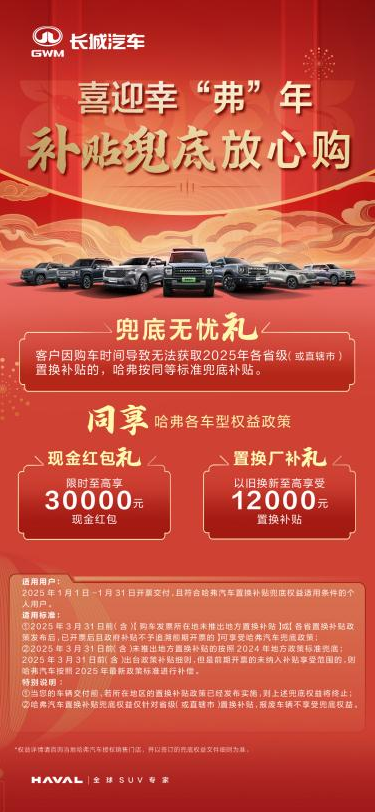 需要注意的是,此次活动适用于2025年1月1日-1月31日开票交付,且符合哈弗汽车置换补贴兜底权益适用条件的个人用户;2025年3月31日前(含)【购车发票所在地未推出地方置换补贴】或【各省置换补贴政策发布后,已开票后且政府补贴不予追溯前期开票的】可享受哈弗汽车兜底政策。
