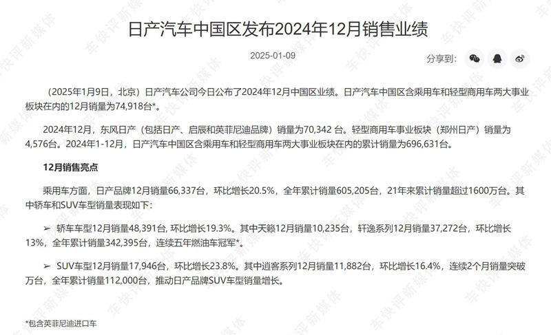 根据1月9日日产中国官方所发布的销量数据显示,2024年1~12月日产中国包含,乘用车轻型商用车辆累计销量69.7万辆,同比降幅超12%。