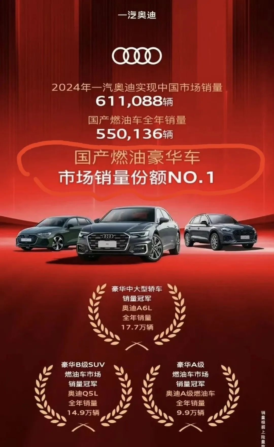 奥迪中国公布的销量数据则更具针对性。2024年,一汽奥迪累计销售61.1088万辆新车,奥迪强调其在国产燃油豪华车市场的销量份额第一。此外,奥迪还分别在“豪华中大型轿车”“豪华B级SUV燃油车”以及“豪华A级车”三个细分市场中取得了冠军。这一数据表明,奥迪在传统燃油车领域的优势依然明显,尤其是在细分市场的深耕使其在特定领域保持竞争力。