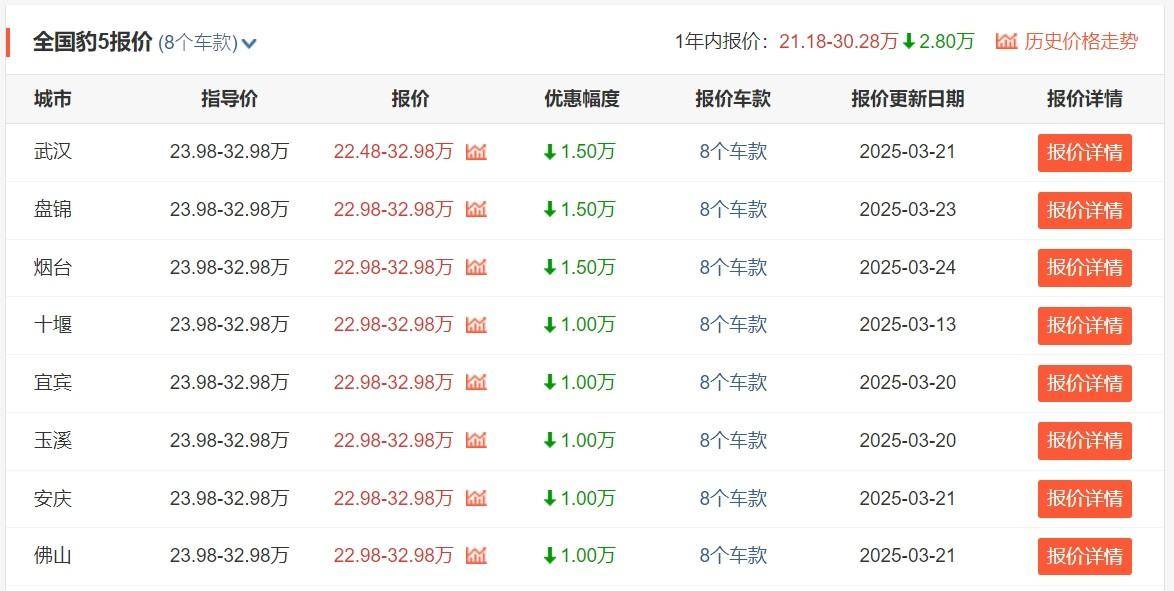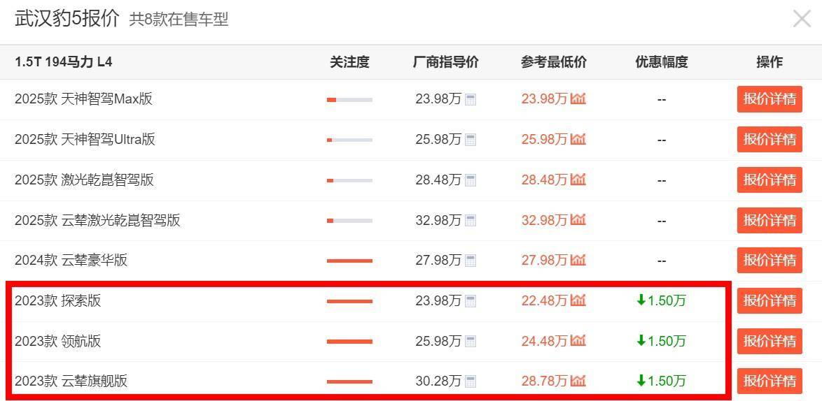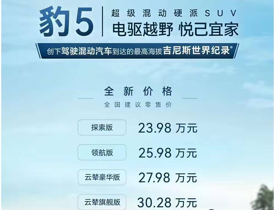 自从去年7月29日,方程豹厂家把豹5的售价区间从28.98-35.28万元调整到23.98-30.28万元区间之后,这款车型便在后续的多个月时间里斩获到了硬派SUV市场销量冠军的宝座。