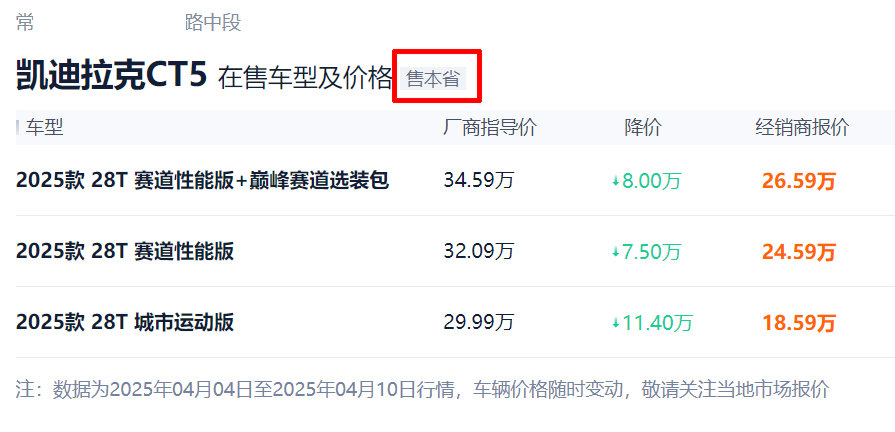 因为凯迪拉克CT5(参数|询价) 2025款的终端门店实际售价可以更低,目前的城市运动版显示最低门槛价为18万级;或许统计数据中包括二级渠道的成交价,当然也是以分期为前提的价格,可是相较于21.59万元的售价还是值得去看一看的。并且客观上有些区域的门店没有太多附加条件,只是要求分期,价格也来到了18.59万元起;参考下图数据,这是江苏某门店于四月份在线上公布的价格方案。