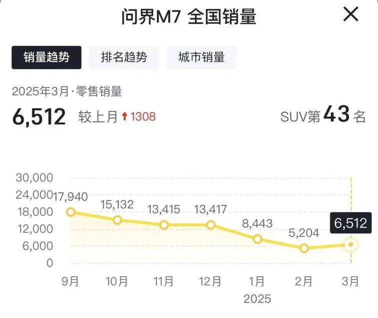 3月数据显示,问界M7销量6512辆,问界M9销量5103辆,问界M5(参数|询价)销量1064辆,这与去年月销超1万辆2万辆相差也太大了吧!特别是问界M7和问界M9,还有销量回暖的机会吗?