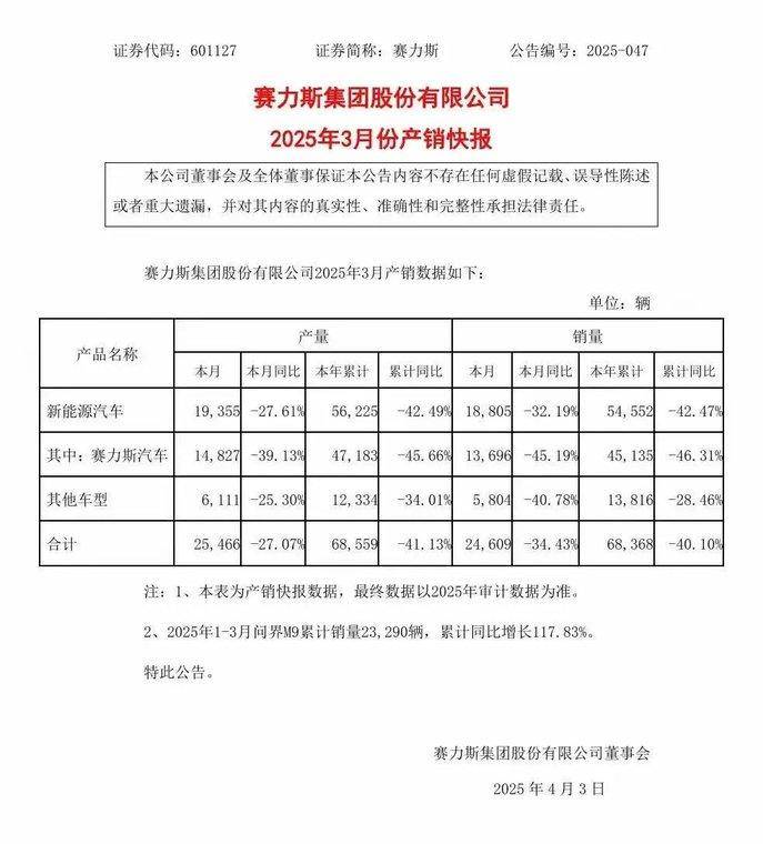 直到赛力斯集团公布产销快报后才明白,3月赛力斯汽车销量13696辆,同比暴跌45.19%;赛力斯汽车2025第一季度销量为45135辆,同比暴跌46.31%。