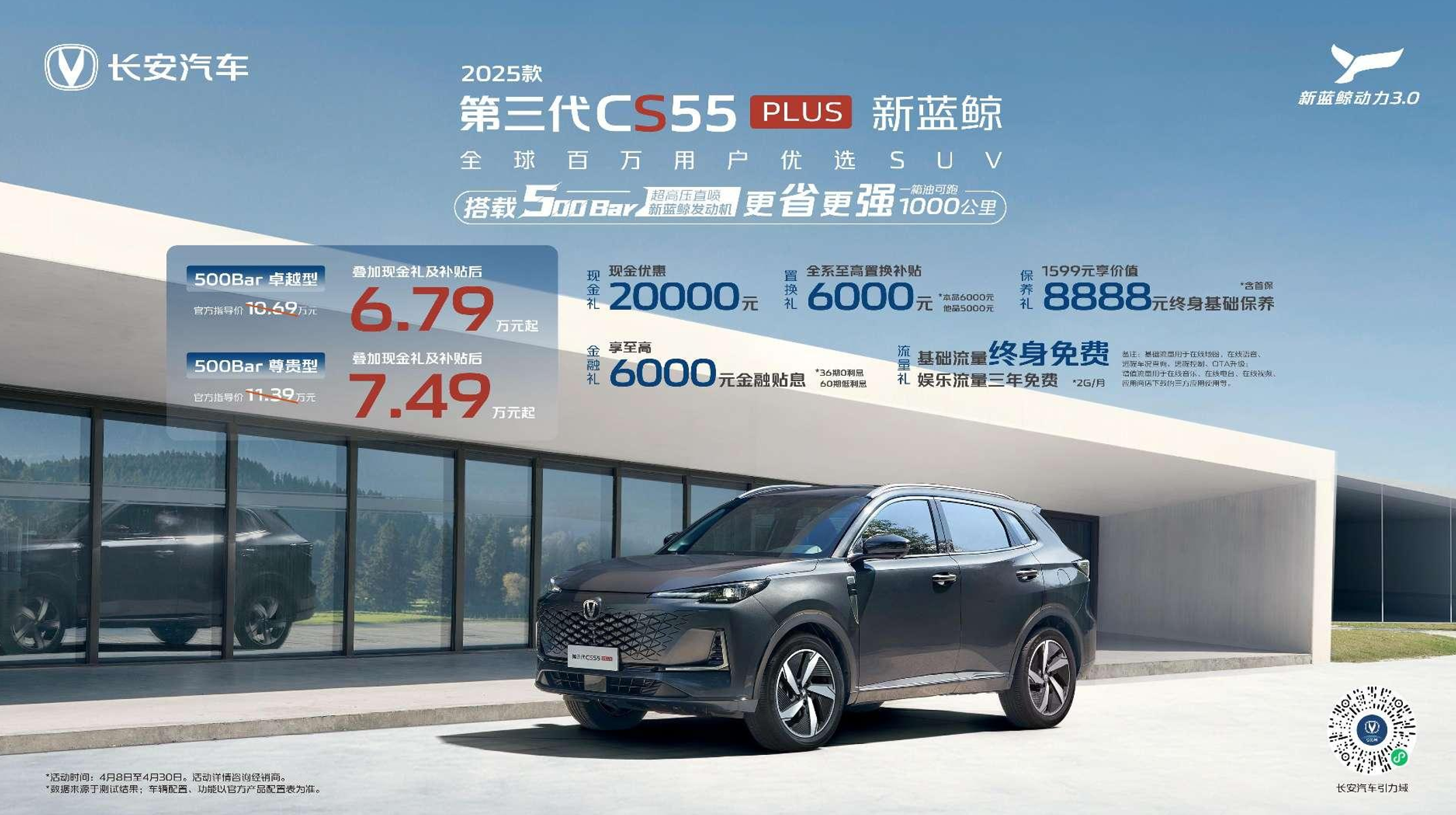 长安CS55系列从第一代车型问世,就以硬核实力彻底终结小型SUV的时代,重新定义家用SUV的标准。作为全球累计销量超过100万辆的爆款“国民SUV”,CS55系列始终以高质价比和高品质赢得用户信赖。此次,2025款第三代CS55PLUS焕新升级,将以更超值的姿态,续写传奇!2025款第三代CS55PLUS搭载500Bar超高压直喷新蓝鲸发动机,最大功率141kW,最大扭矩310N·m,同级地表最强动力,强劲比肩2.0T。在500Bar超高压直喷技术赋能下,2025款第三代CS55PLUS无论是起步、超车、爬坡等驾驶情况,动力充沛,随叫随到,零百加速仅7.9秒。与之匹配的蓝鲸新一代7速湿式双离合自动变速器,升档冲击降低20%,平顺性大幅提升,传动效率高达96%,油耗再降5%,历经300万公里严苛测试,品质更可靠。