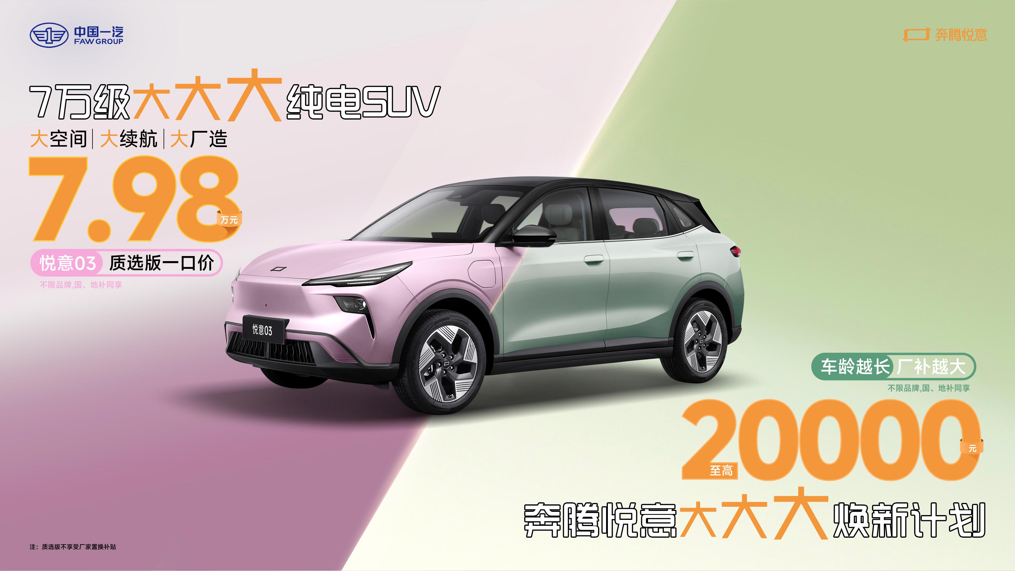 在上海车展前夕,悦意03重磅加推“质选版”,一口价7.98万元,这让一台纯电紧凑型SUV价格直接下探到7万级。据悉,下订的用户还可享价值3000元的限时质选包,置换还有补贴,厂补至高2万元,再加上国补、地补等多重补贴福利加码,让这台车的性价比更升一个档次。