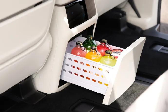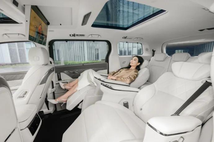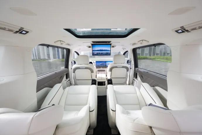 全车座椅采用Nappa真皮,前两排座椅配备通风/加热/10点式按摩,第二排双零重力座椅,12.5升车载冰箱,高山9还有专属的动态星空穹顶。