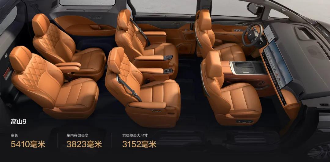 高山9的车身尺寸达到5410/1960/1890mm,轴距3275mm,采用2+2+2的6座布局,主打六座皆C位,第二排与第三排均配备航空座椅。