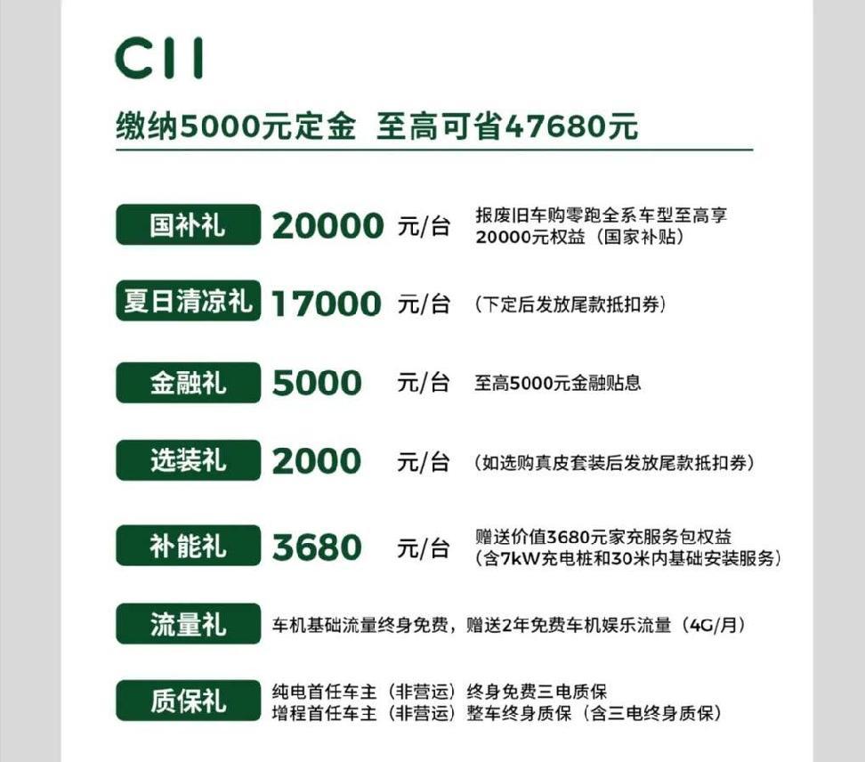 目前零跑C11增程版的起售价格在14.88万元起,叠加2025年国补、置换补贴和品牌优惠后,实际入手价可低至10.78万元。以增程200智享版为例: