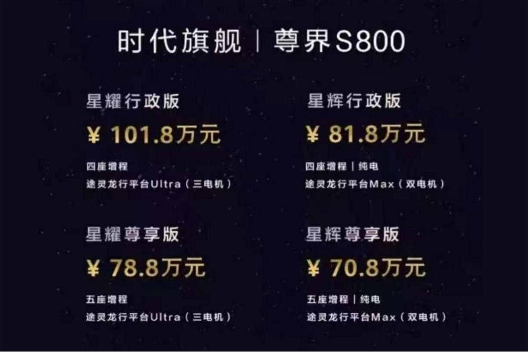 如果说技术是尊界S800的矛,那么定价策略便是其盾。从预售100万—150万到上市70万起,这一波“高开低走”堪称营销经典,50-100万的BBA绝对招架不住,同价位的宝马7系、奥迪A8L和奔驰S级,瞬间不香了。入门款拉低门槛,70万就能买三电机四驱+鸿蒙座舱,BBA同级车却是“裸奔”;顶配款守住调性,百万级配置对标“迈宾劳”,但技术体验领先一个时代。
