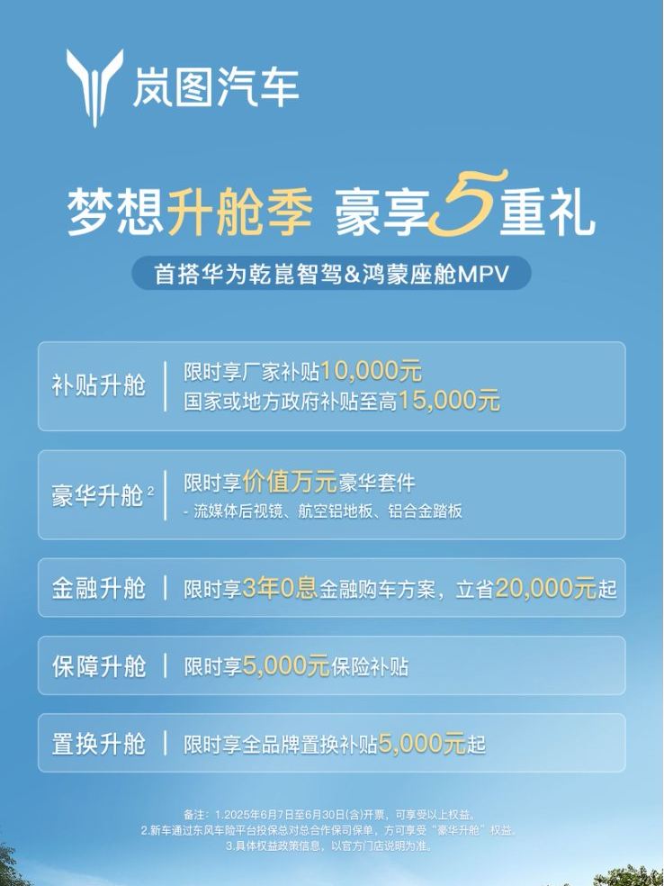 在高端MPV市场,岚图梦想家的出现及走红,不仅仅是MPV市场的旺盛需求起到了推进作用。更重要的是岚图懂得细分市场的用户到底需要什么,扎实的品质叠加智能舒适产品力,从内部构建起了销量的护城河。最后提醒一下大家,岚图梦想家限时销售政策从6月7日开始,到6月30日结束,感兴趣的朋友要尽快行动了。