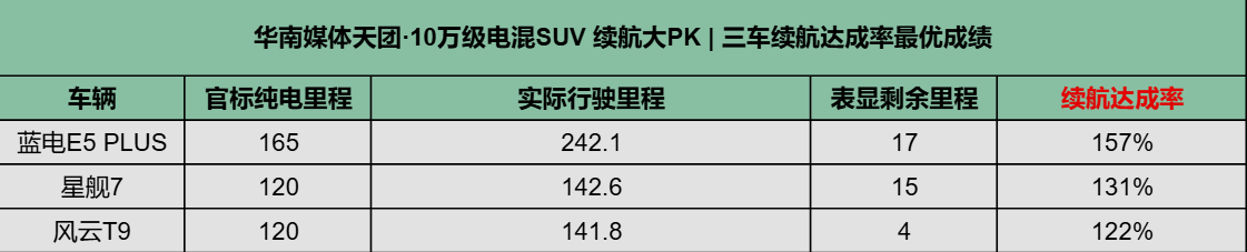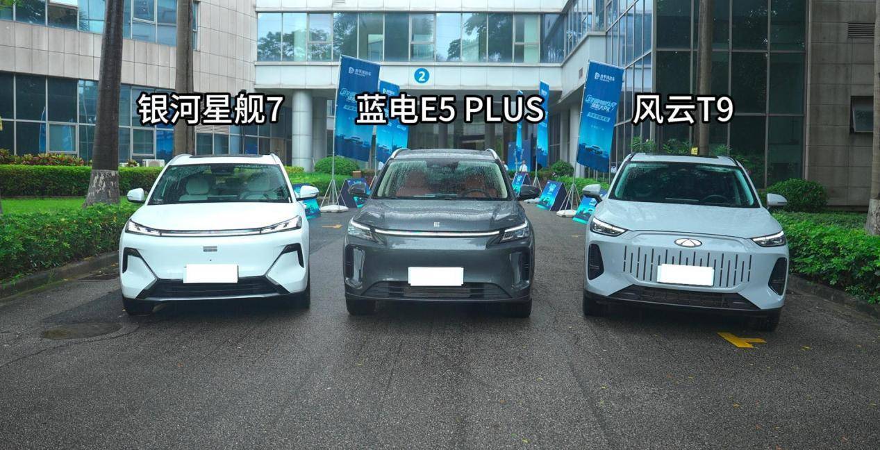 我们先看续航。前段时间有权威媒体携手华南媒体天团,开展十万级插混SUV纯电续航大PK,众测决出“谁才是十万级最强纯电续航耐力王”的活动,有三款车型进行对比,分别是蓝电E5 PLUS先享版Ultra、银河星舰7 2025款120km探索+版、风云T9 2024款 120km舒适型。