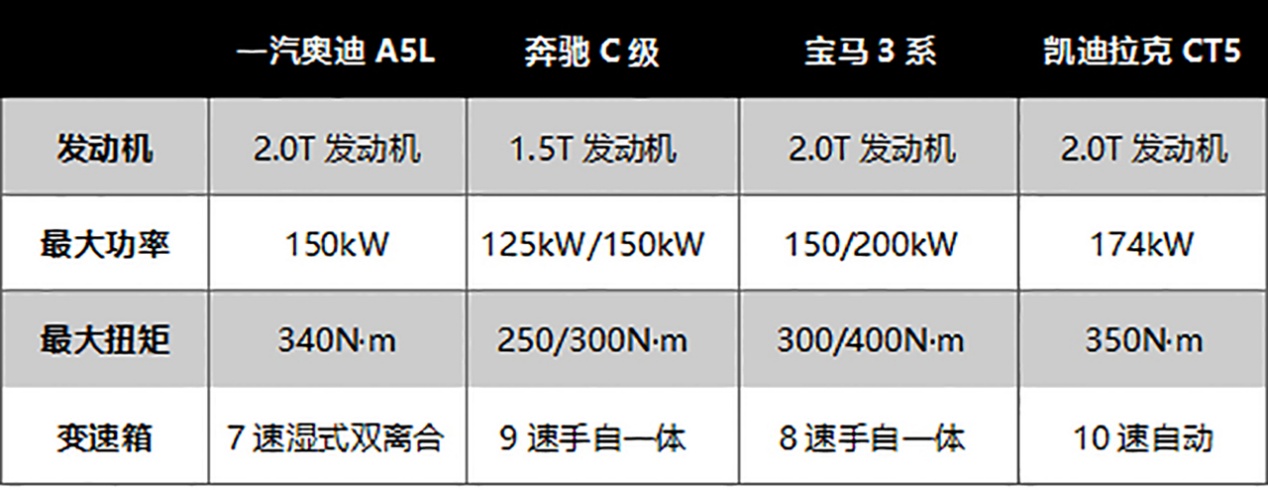 一汽奥迪A5L搭载的是2.0T发动机,相比奔驰C级搭载的1.5T发动机,动力参数有一定优势,爆发力更强。宝马3系和凯迪拉克CT5本身主打的就是操控性,它们搭载的2.0T发动机提供了更强劲的动力输出,加速性能也表现不错。