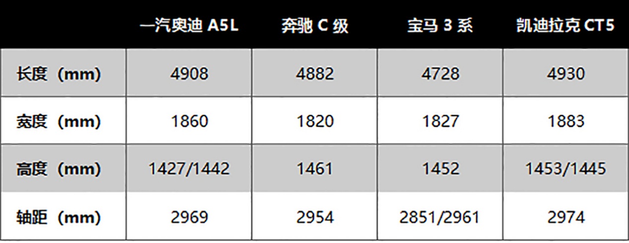 一汽奥迪A5L上市后的竞争对手会锁定奔驰C级、宝马3系、凯迪拉克CT5等,车身尺寸在CT5面前没啥优势,不过比奔驰C级和宝马3系都大了不少,尤其在长度和轴距上的优势会更明显一些。