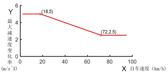 减速度变化率规定具体如下:当自车车速大于72km/h时,减速度变化率不应超过2.5m/s3;当自车车速小于18km/h时,减速度变化率不应超过5m/s3;当自车车速为18km/h至72km/h之间,减速度变化率线性变化,如下图所示:
