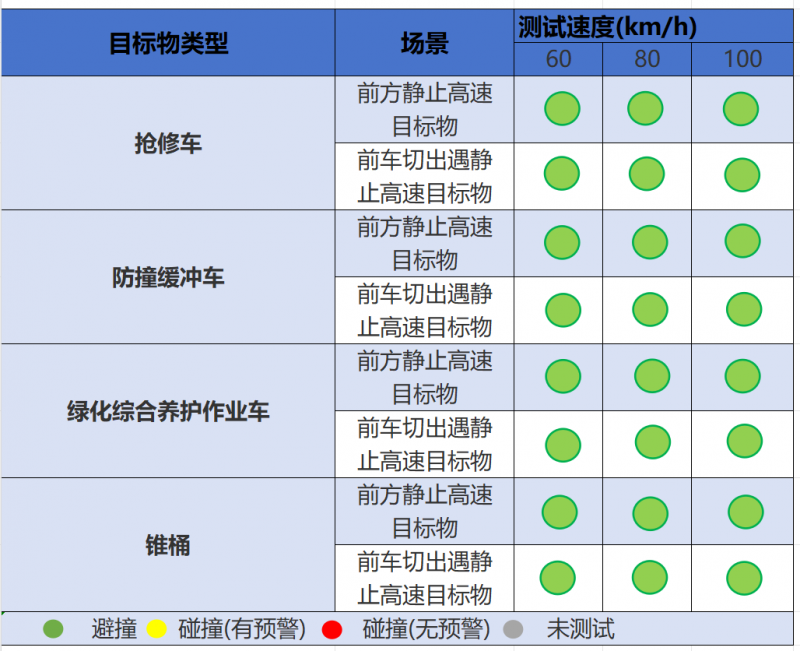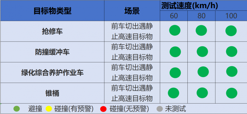 (如车辆在当前试验车速无法通过,则不进行更高车速测试;前方静止高速目标物场景:前方高速作业车处于静止状态;前车切出遇静止高速目标物场景:试验车辆跟随前车行驶,当前车距离静止目标物一定距离时,前车换道行驶。)