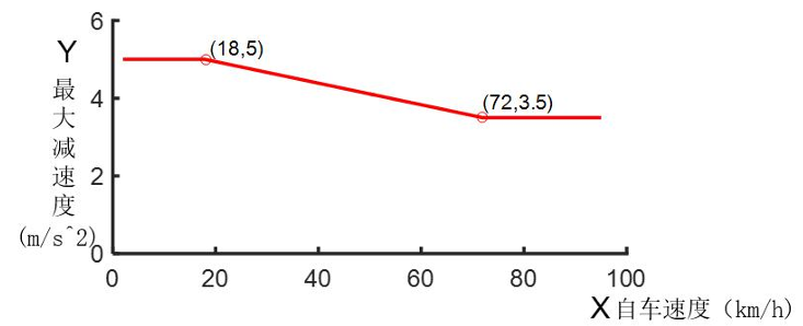 关于舒适性指标中的减速度规定具体如下:当自车车速大于72km/h时,减速度不应超过3.5m/s2;当自车车速小于18km/h时,减速度不应超过5m/s2;当自车车速为18km/h至72km/h之间,减速度线性变化,如下图所示: