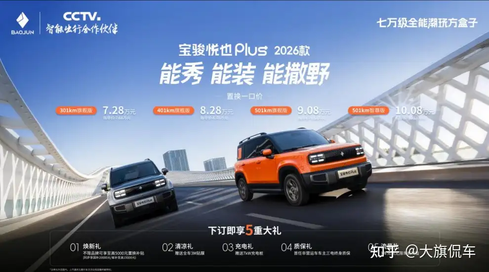 宝骏悦也 Plus 2026 款推出 301km 旗舰版 、401km 旗舰版 、501km 旗舰版 、501km 智尊版四款配置可供选择,置换一口价为 7.28 万 -10.08 万元 。此外,现在下订即享 5重大礼,包括焕新礼:不限品牌至高 5000 元置换补贴;清凉礼:赠送全车 3M 贴膜;充电礼 :赠送 7kW 充电桩;质保礼:首选非营运车主三电终身质保;流量礼: 3年免费无限车机流量。此外可叠加享受至高 20,000 元的国家 /地方补贴。广大用户可通过官方线上渠道(宝骏汽车 App 、宝骏汽车小程序)下订预约。