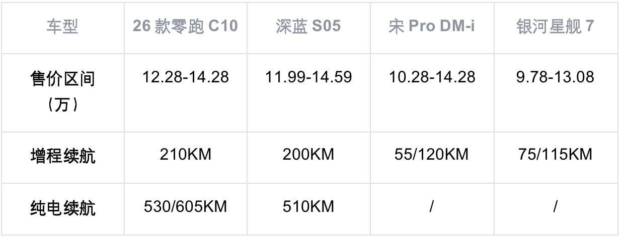 选择家用SUV的用户,他们对于价格相当敏感,希望所花的每一分钱都花在刀刃上,所以价格是相对重要的。2026款零跑C10的售价区间为12.28-14.28万元,提供了增程和纯电两种方案,能够适合不同用户的诉求。深蓝S05的售价区间为11.59-14.59万元,吉利银河星舰7的售价区间为9.78-13.08万元,比亚迪宋Pro DM-i的售价区间为10.28-14.28万元,看似深蓝S05、吉利银河星舰7以及比亚迪宋Pro DM-i的售价相对较低,但星舰7的纯电续航为55KM、120KM,比亚迪宋Pro DM-i的纯电续航里程分别为75KM、115KM,深蓝S05增程版的纯电续航是200KM,但是起售价为13.59万元,而2026款零跑C10增程版的纯电续航里程为210KM,起售价12.28万起,续航更长,但是价格更低,所以零跑C10的售价是不是更有诚意?