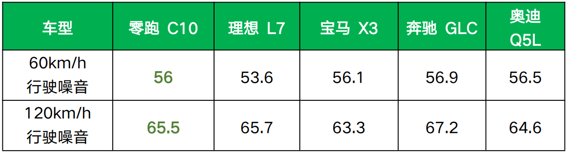 在NVH方面,2026款零跑C10采用了100多项静谧性优化、40处声学包设计,60km/h行驶噪音56dB,120km/h行驶噪音65.5dB,比理想L7、宝马X3、奔驰GLC等车型做得都要好,有着“越级”的表现。