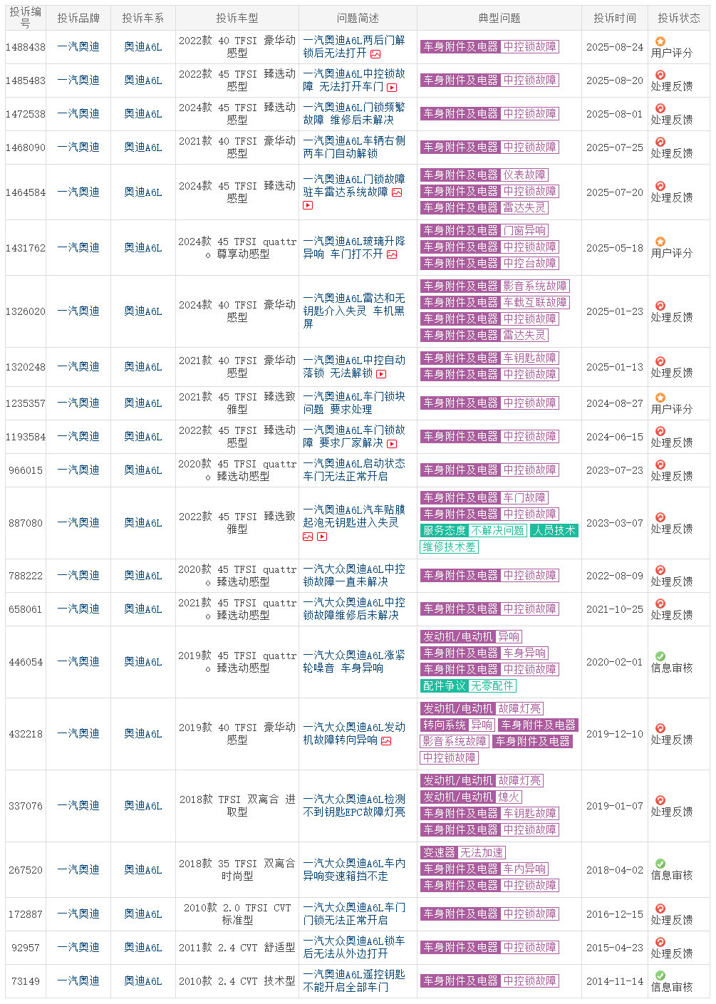 然而车辆中控锁出现偶发性锁车后还能打开或解锁后打不开车门的情况,看来不是个例;在全国汽车消费者投诉受理处置服务平台的公开数据里,2024款奥迪A6L有不到20例关于中控锁故障的投诉,并且其中有“维修后未解决”的描述。并且在更早的2022款车型中也有类似的情况。某汽车博主称近期已连续收到超过二十位车主反馈相似故障,同时表示“厂家技术人员私下承认这一批次的某型号门锁控制模块存在缺陷;”品牌方尚未对该汽车博主的说法进行回应,是否为事实只有拭目以待。