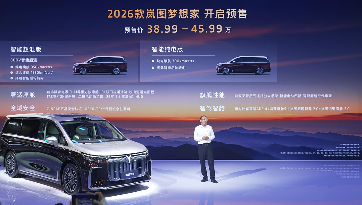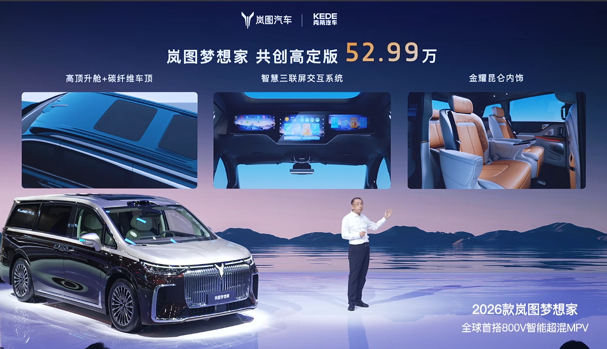 其中,2026款岚图梦想家(参数|询价)开启预售,预售价:38.99万-45.99万元,将于9月上市;岚图梦想家共创高定版发布,售价:52.99万元。